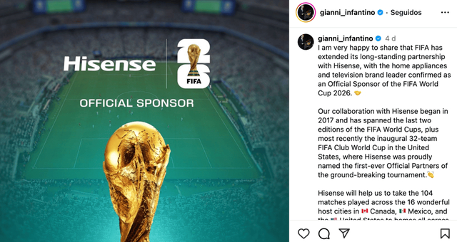 官宣当日,国际足联主席因凡蒂诺在社交媒体上罕见点名发声,高度评价双方的合作关系:「我荣幸宣布,国际足联与长期战略合作伙伴海信集团正式完成续约。作为全球领先的家电与消费电子品牌,海信已确认成为 2026 年世界杯™全球官方赞助商。」